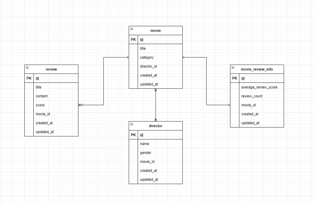 마지막으로 영화는 여러 개의 리뷰를 가질 수 있지만 리뷰는 하나의 영화를 상대로 작성이 되기 때문에 다대일, 일대다 관계가 형성된다
