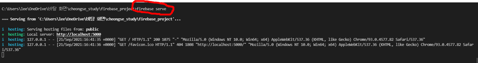 그다음 index.html 파일 body 태그 안 script 위에 Hello FireBase라고 입력한 후 콘솔 창에 Firebase serve라는 명령어를 실행시킨다.