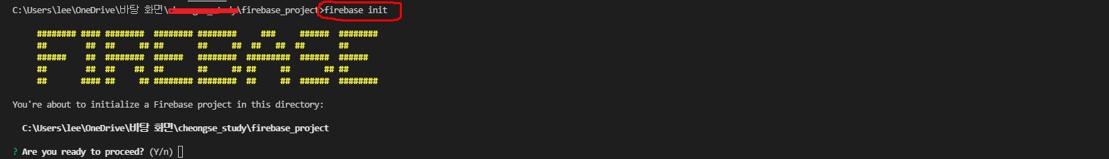 로그인이 끝나면 프로젝트를 생성해 줘야 하는데 해당 프로젝트 폴더에서 명령 창에 firebase init이라는 명령어를 실행한다. 그럼 질문이 나오는데 하나씩 같이 진행해 보자