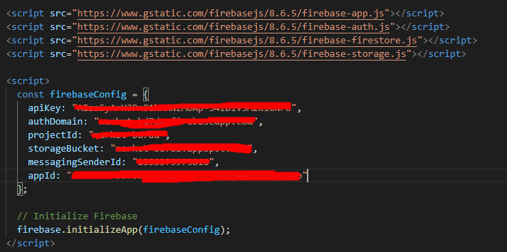 새로 만든 index.html 파일 body 태그 안에 위와 같이 넣어 준다. 기본적으로 생성된 index.html 파일에는 아마 firebase 9.x 버전으로 만들어져 있을 텐데 나 같은 경우 8.x 버전으로 사용하기 위해 새로 생성해서 위와 같은 코드들을 넣어 주었다. 사용하고자 하는 기술들의 스크립트를 가져오면 된다. 참고로 firebase 9.x 버전과 8.x 버전의 사용법이 다르기 때문에 정보가 더 많은 8.x 버전을 사용 했다.