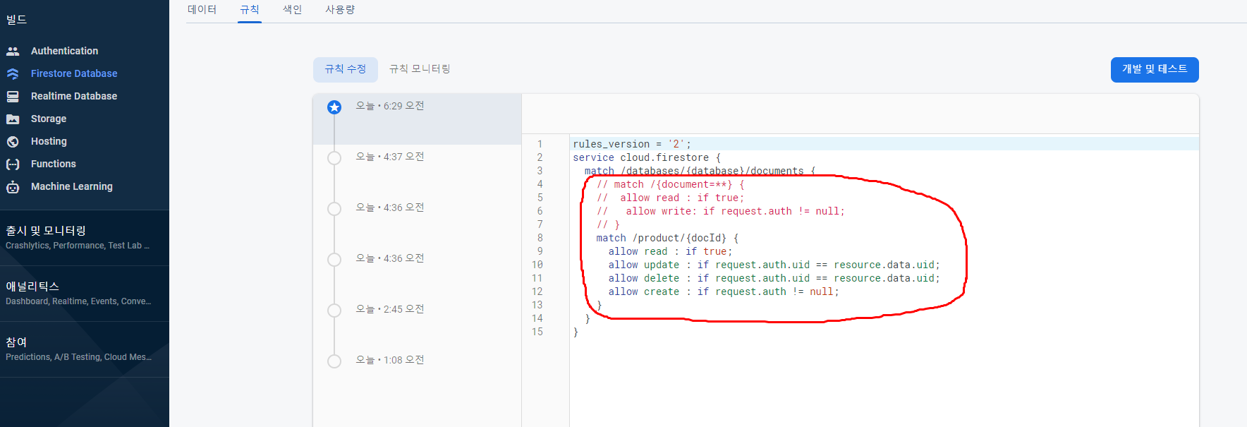 그리고 resource.data.uid 는 product 컬렉션에 해당하는 문서 ID가 갖고 있는 uid 값을 가져오는 것이다. 나는 글을 등록할 때 현재 로그인된 사용자의 uid로 필드에 추가해서 넣어줬기 때문에 저런 식으로 가져올 수 있다.