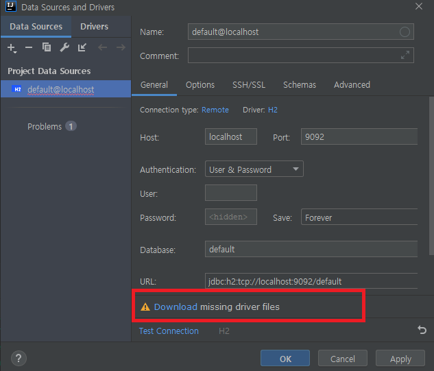 그 뒤에 URL 부분에 서버 실행시 로그에 떴던 jdbc:h2:mem:...... 이 주소를 복사해서 넣어 준 뒤 Test Connection을 해보면 성공했단 메시지가 뜨고 그 뒤에 OK를 눌러서 연결하면 된다