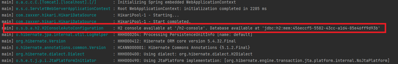 h2설정에 enabled를 true 준뒤에 서버를 실행해 보면 아래와 같은 로그를 확인해 볼 수 있다